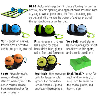 The Whole Body Kit™ brings together all the tools you need to take care of yourself from head to foot: the Neck Track, Body Track, and sets of the Firm, Soft, Sport, 4 Inch, and Very Soft massage balls. This kit is everything you need for complete self-myofascial release.